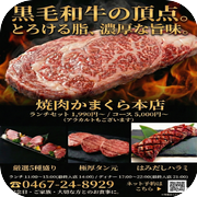 鎌倉駅徒歩2分、窓の向こうに鶴岡八幡宮二の鳥居が広がる贅沢なロケーション。肉のプロも認める「国産黒毛和牛」を毎日丁寧に手切りし、生でも食べられるほど新鮮で極上のお肉を、秘伝のタレ2種と無煙ロースターの遠赤外線で焼き上げます。さらに自家製のサイドメニューも大好評!